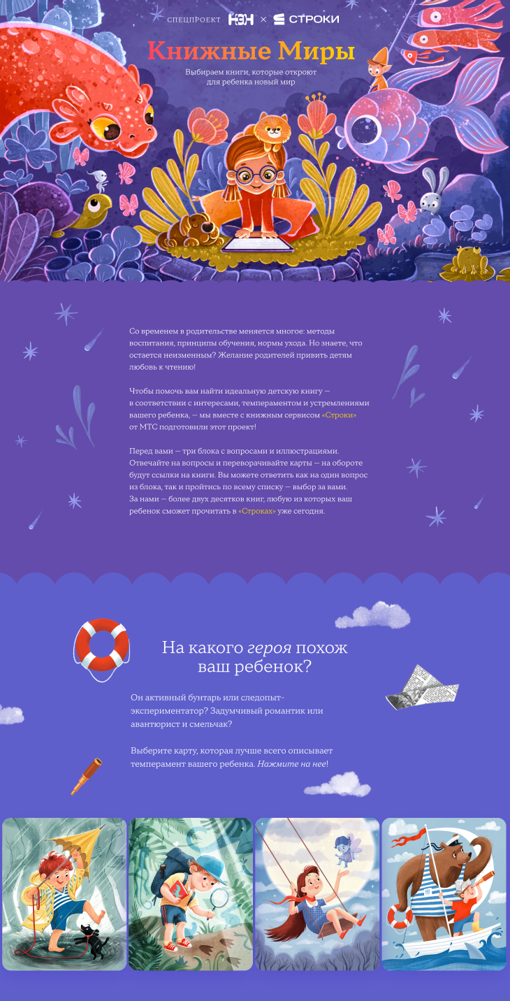 Чтобы помочь читателям найти идеальную детскую книгу — в соответствии с интересами, темпераментом и устремлениями ребенка, — НЭН вместе с книжным сервисом «Строки» от МТС подготовили этот проект!